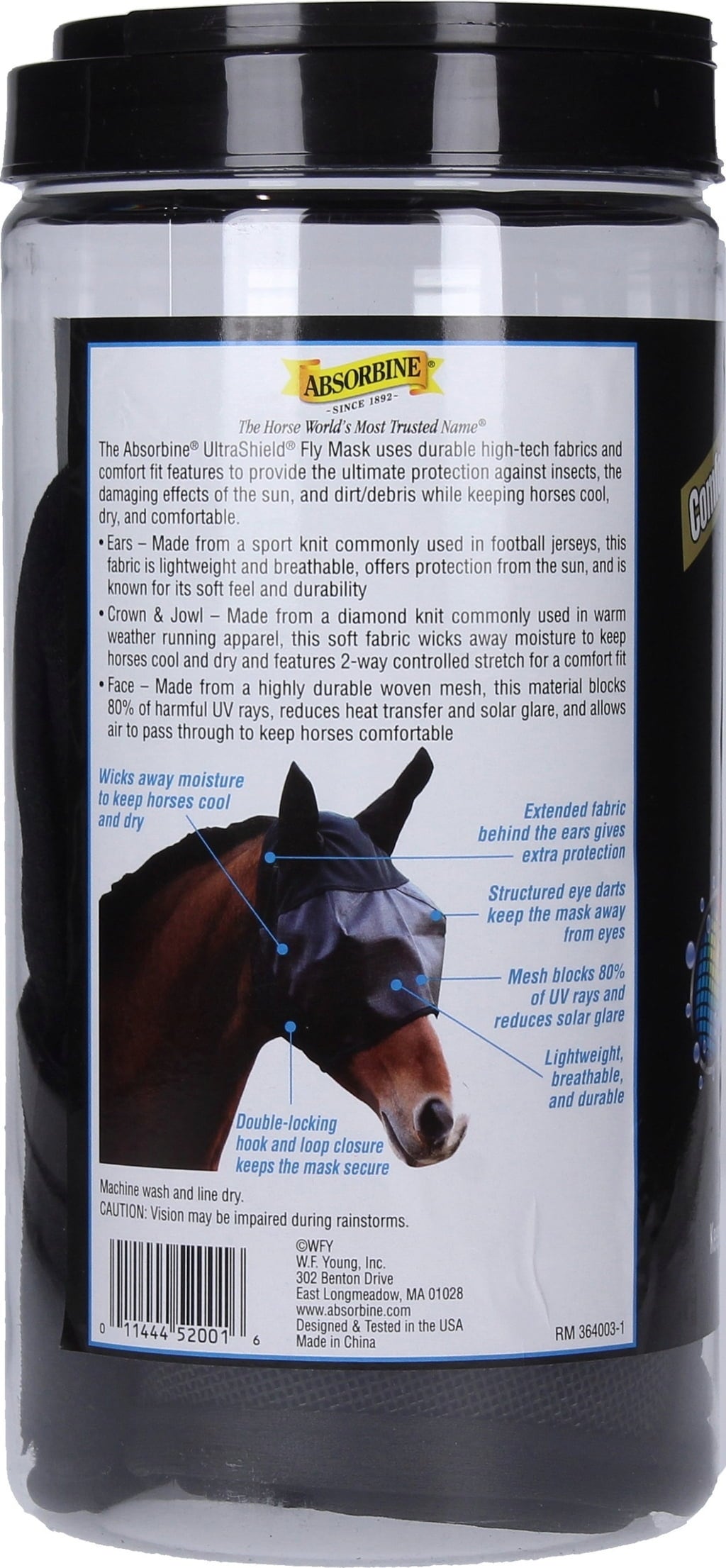 Ta maska przeciw owadom Absorbine jest wykonana z zaawansowanych technologicznie materiałów, które utrzymują głowę konia w optymalnym chłodzie i suchości. Aby zapewnić doskonałą jakość, drobno strukturalna, odporna na promieniowanie UV siatka na twarz jest połączona z rozciągliwym materiałem w okolicy policzków i czoła oraz wgłębieniami na uszy wykonanymi z wytrzymałej funkcjonalnej tkaniny, a także mocnym podwójnym zapięciem na rzep. Wybrzuszenia w okolicy oczu sprawiają, że noszenie jest jeszcze wygodniejsze.