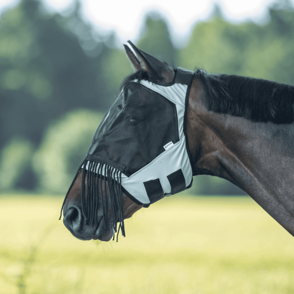 Szczególnie przemyślane jest zabezpieczenie wrażliwej okolicy nosa: zamiast sztywnej siatki zastosowano luźno opadające frędzle, które odstraszają owady, nie ograniczając przy tym nozdrzy. Lekki i elastyczny materiał funkcyjny miękko dopasowuje się do ganaszy, a strategicznie rozmieszczone podszycie z przewiewnej tkaniny 3D nad oczami zapewnia stabilny dystans i wysoki komfort noszenia. Dzięki szerokim zapięciom na rzep maskę można łatwo i indywidualnie dopasować, aby koń mógł w pełni swobodnie i spokojnie cieszyć się letnim wypasem.