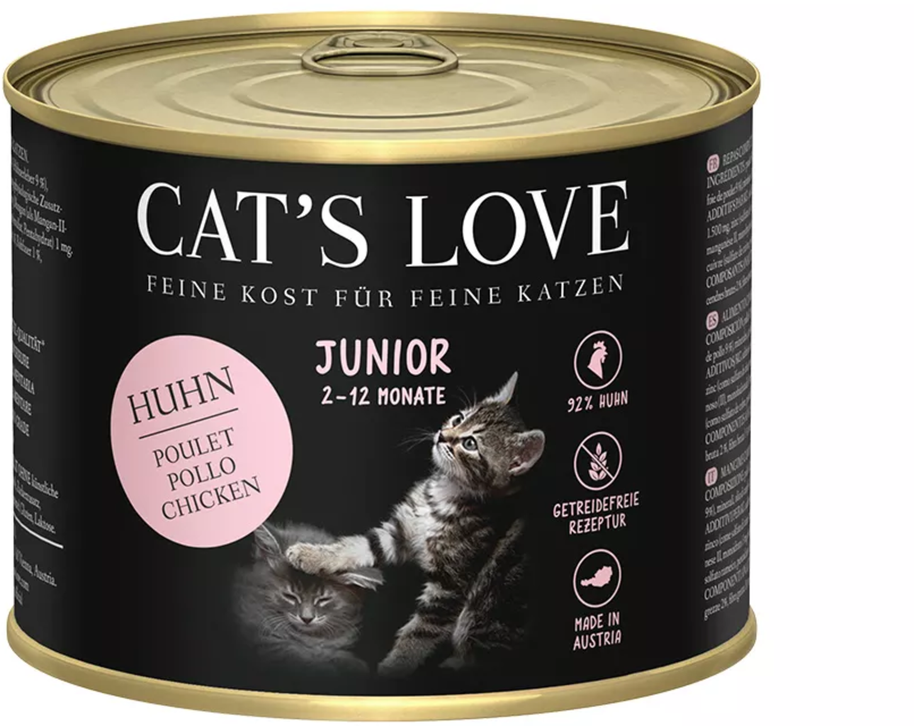 Doskonała receptura o wysokiej zawartości mięsa w 100% jakości spożywczej, opracowana specjalnie dla kociąt i dostosowana do ich potrzeb żywieniowych. Smaczny kurczak wzbogacony jest cennymi wodorostami i olejem szafranowym. Najwyższa jakość z Austrii.