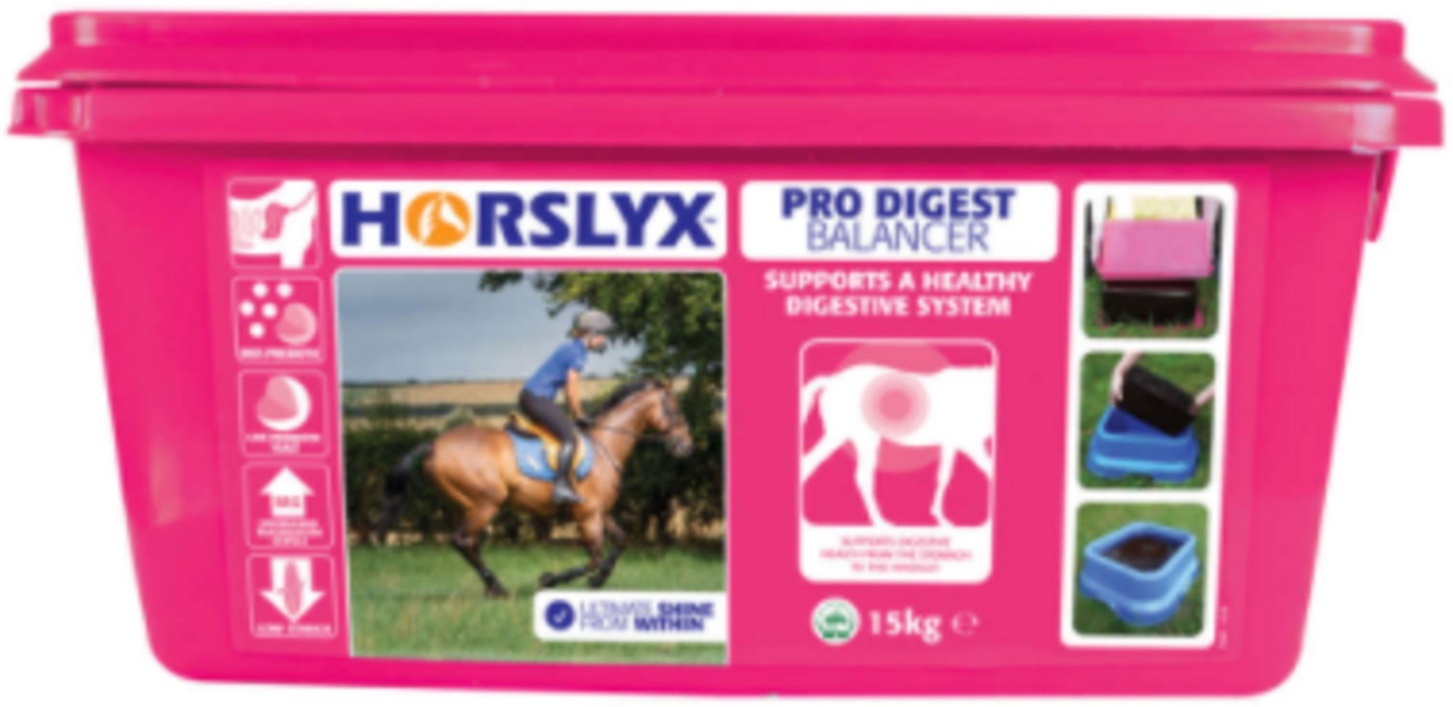 Oprócz dobrze znanej, zbilansowanej mieszanki składników odżywczych, Horslyx Pro Digest zawiera mielone wodorosty i porcje kory wiązu. Wodorosty mają działanie buforujące w jelicie grubym i wraz ze śliną wytwarzaną podczas lizania, bogatą w wodorowęglany, pomagają uniknąć zakwaszenia.