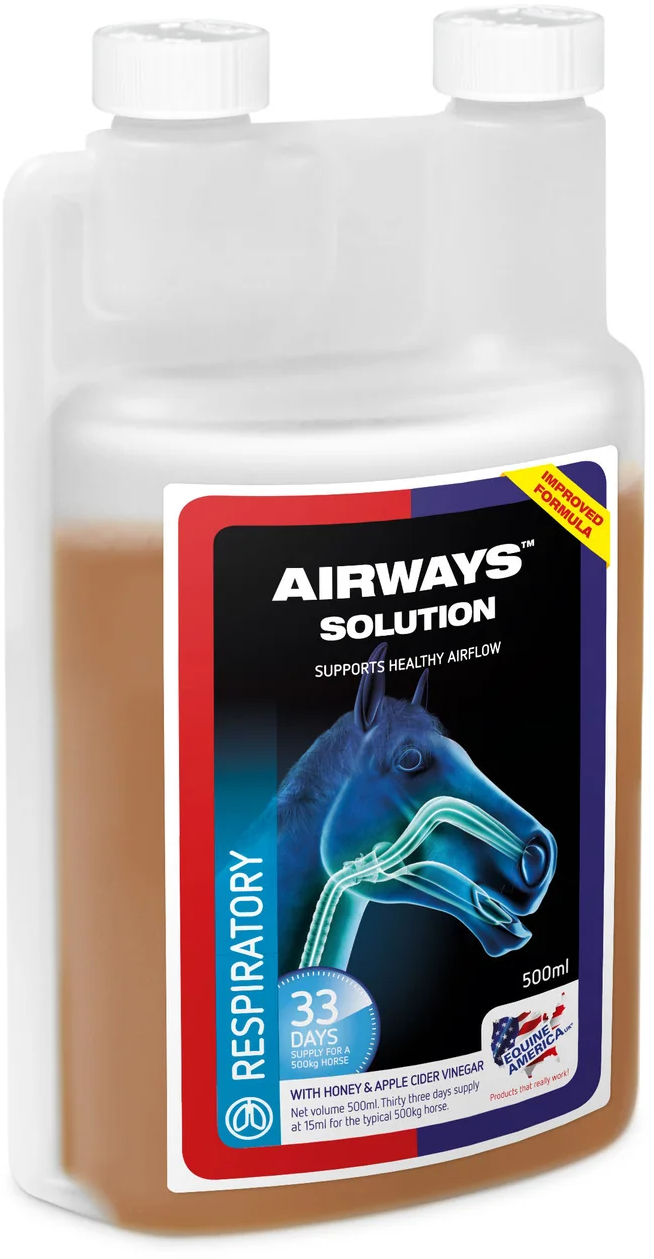 Airways Solution został opracowany, aby zapewnić koniom i kucom wsparcie przed codziennym narażeniem na kurz, pyłki lub zarodniki. Płynna formuła wykorzystuje właściwości olejku eukaliptusowego i miętowego, a także mentolu, które znane są ze swojego pozytywnego wpływu na drogi oddechowe. Kombinację tę uzupełniają miód i ocet jabłkowy, które dbają o wrażliwe błony śluzowe dróg oddechowych.