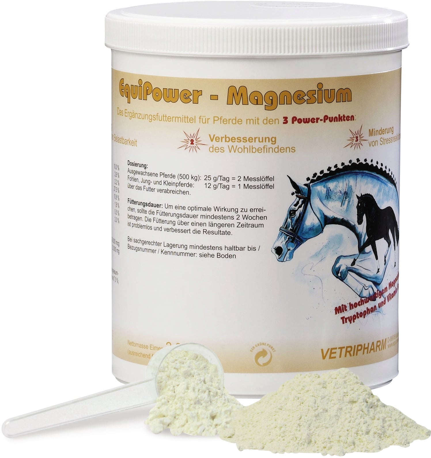 Okres karmienia powinien wynosić co najmniej 2 tygodnie. Bezproblemowo można podawać magnez z EquiPower przez dłuższy okres czasu lub przez cały rok.