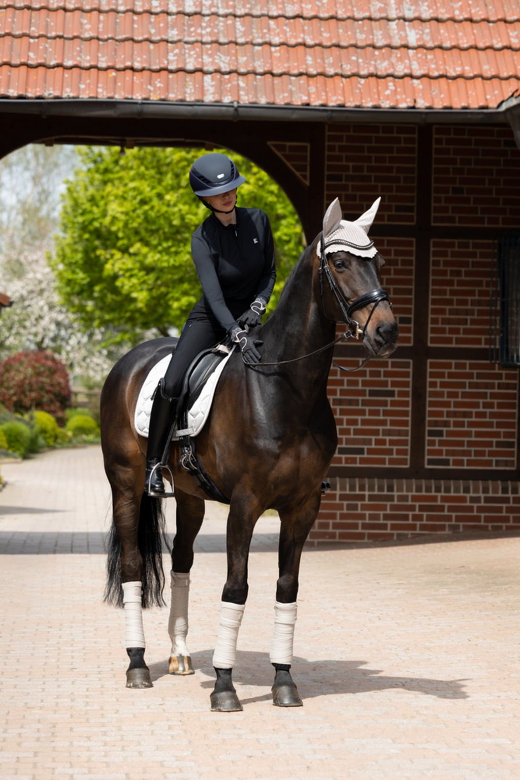 Dzięki elastycznym bandażom z polaru można wygodnie ustabilizować nogi konia i chronić je przed lekkim obciążeniem. Wysokiej jakości zapięcie na rzep zapewnia bezpieczne mocowanie, a praktyczna torba na zamek błyskawiczny ułatwia przechowywanie i transport.