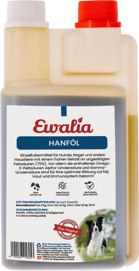 Olej konopny Ewalia dla zwierząt domowych ma szerokie zastosowanie. Olej tłoczony na zimno nie zawiera znaczących ilości THC. Jest w 100% czysty, nie zawiera dodatków, ale ma wysoką zawartość wielonienasyconych kwasów tłuszczowych (75%). Ponadto olej konopny zawiera niezbędne aminokwasy, witaminy, przeciwutleniacze, minerały, enzymy i fitochemikalia.