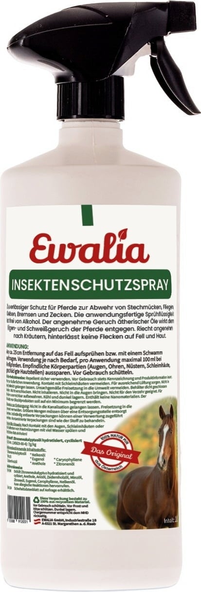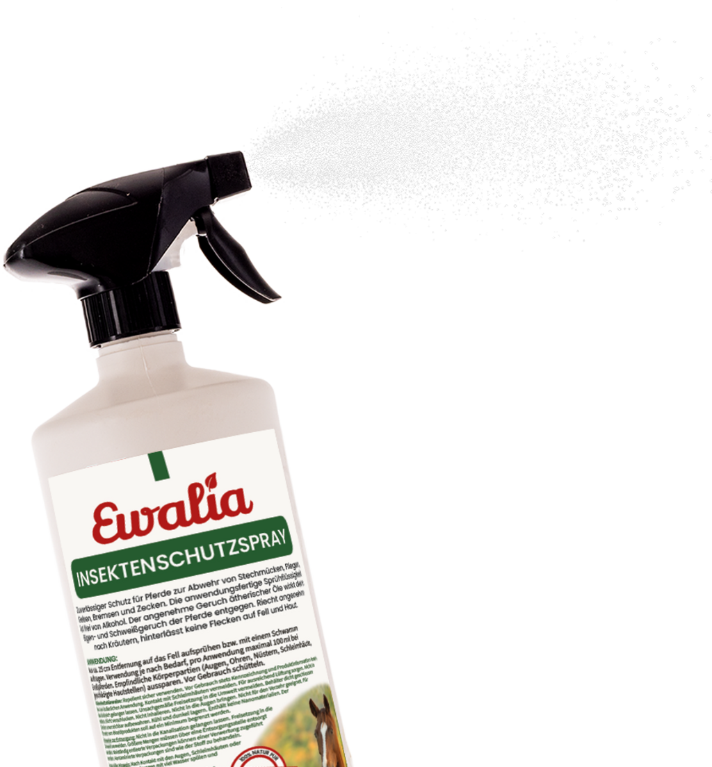 Spray przeciw owadom EWALIA to niezawodna i bezchemiczna ochrona koni przed muchami, komarami, końskimi muchami i kleszczami. Można go nakładać w razie potrzeby. Unikać okolic oczu i nozdrzy. Spray pachnie bardzo przyjemnie i niezawodnie odstrasza owady.