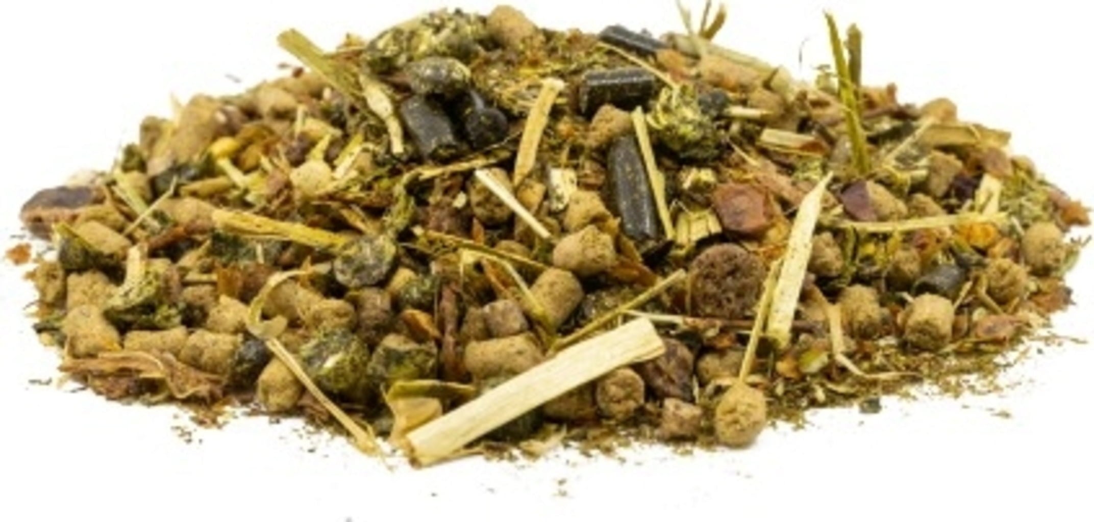 otręby ryżowe, płatki trawy, wytłoki jabłkowe, zielona mączka z lucerny, mieszanka lucerny, soja (pieczony), siemię lniane ekstrudowane, skórki chleba świętojańskiego, nasiona ostropestu plamistego, nasiona czarnuszki, płatki buraczane, liście pokrzywy, płatki z grochu, Calciumcarbonat, olej sojowy, fosforan wapnia, suszona wysłodki buraczane, chlorek sodu, tlenek magnezu