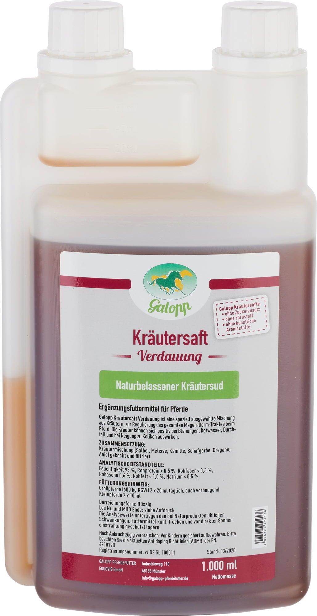 Galopp Sok ziołowy wspomagający trawienie zawiera specjalnie opracowaną mieszankę czystych naturalnych ziół wspomagających pracę przewodu pokarmowego. Rumianek, szałwia i melisa mogą złagodzić skurcze żołądka u konia, pobudzić apetyt i ustabilizować pracę żołądka. Jest to szczególnie ważne w przypadku zwierząt, które mają skłonność do kolki, wody w kale, wzdęć i biegunki. Zawarte w nim garbniki mogą wzmocnić i ustabilizować błonę śluzową jelit.