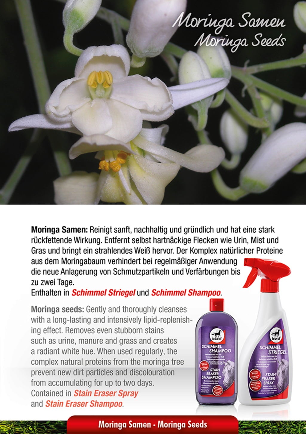 Spryskany bezpośrednio na uporczywe plamy, takie jak mocz, obornik i trawa, brud można łatwo usunąć z sierści. Przebarwienia znikają, a czysta biel pojawia się ponownie i jest promiennie wzmocniona przez efekt olśniewającej bieli. Naturalne proteiny z drzewa moringa zapobiegają gromadzeniu się nowych cząsteczek brudu i powstawaniu przebarwień.