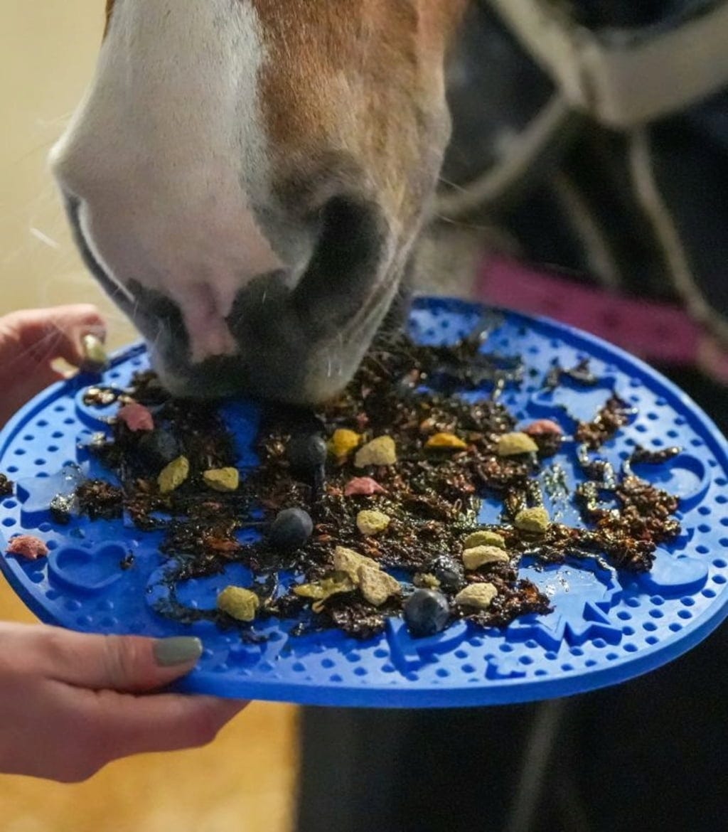 Możesz również użyć maty jako Slow-Feeder, umieszczając ją w wiadrze z paszą - w ten sposób koń będzie jadł paszę wolniej i będzie zajęty jedzeniem przez dłuższy czas.