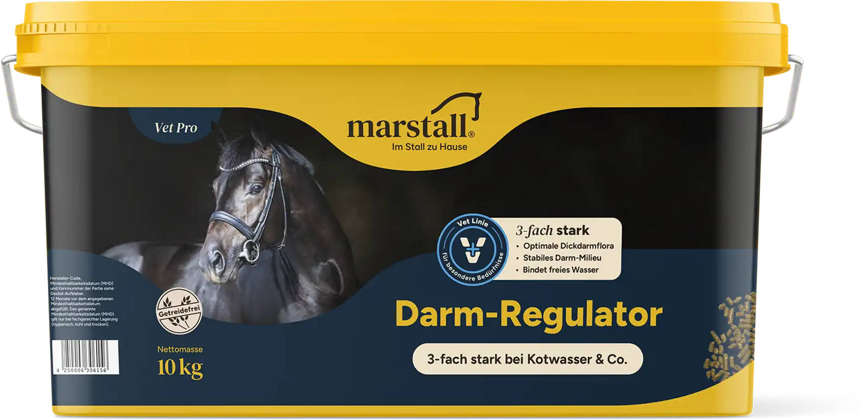 Regulator jelit marstall składa się z czystych naturalnych składników i ma potrójne działanie przeciwko wodzie kałowej. Z jednej strony stabilizowana jest równowaga wodno-elektrolitowa. Z drugiej strony, flora okrężnicy jest regulowana i wspierana przez żywe drożdże probiotyczne. Dodatkowo środowisko jelit jest regulowane przez kojące zioła oraz specjalna mieszanka aktywnych w jelicie, prebiotycznych błonników pokarmowych – błonnika marstall Previta. Regulator jelit nadaje się również do delikatnej odbudowy flory jelitowej np. po odrobaczeniu lub kuracjach antybiotykowych.