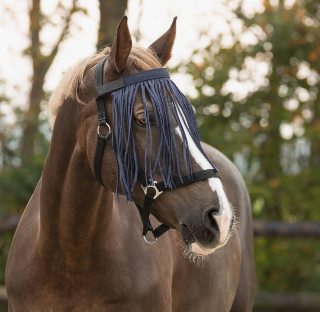 Frędzle przeciw muchom firmy QHP zapewniają koniowi skuteczną ochronę przed irytującymi owadami w okolicy głowy - bez konieczności stosowania sprayu przeciw owadom. Dzięki prostemu zapięciu na rzep, frędzle można szybko i bezpiecznie przymocować do uzdy. Kontrastujący kolorystycznie przedni pasek nie tylko zapewnia bezpieczne dopasowanie, ale także dodaje modnego akcentu. Idealne na przejażdżki, wypas lub relaksujące godziny na padoku