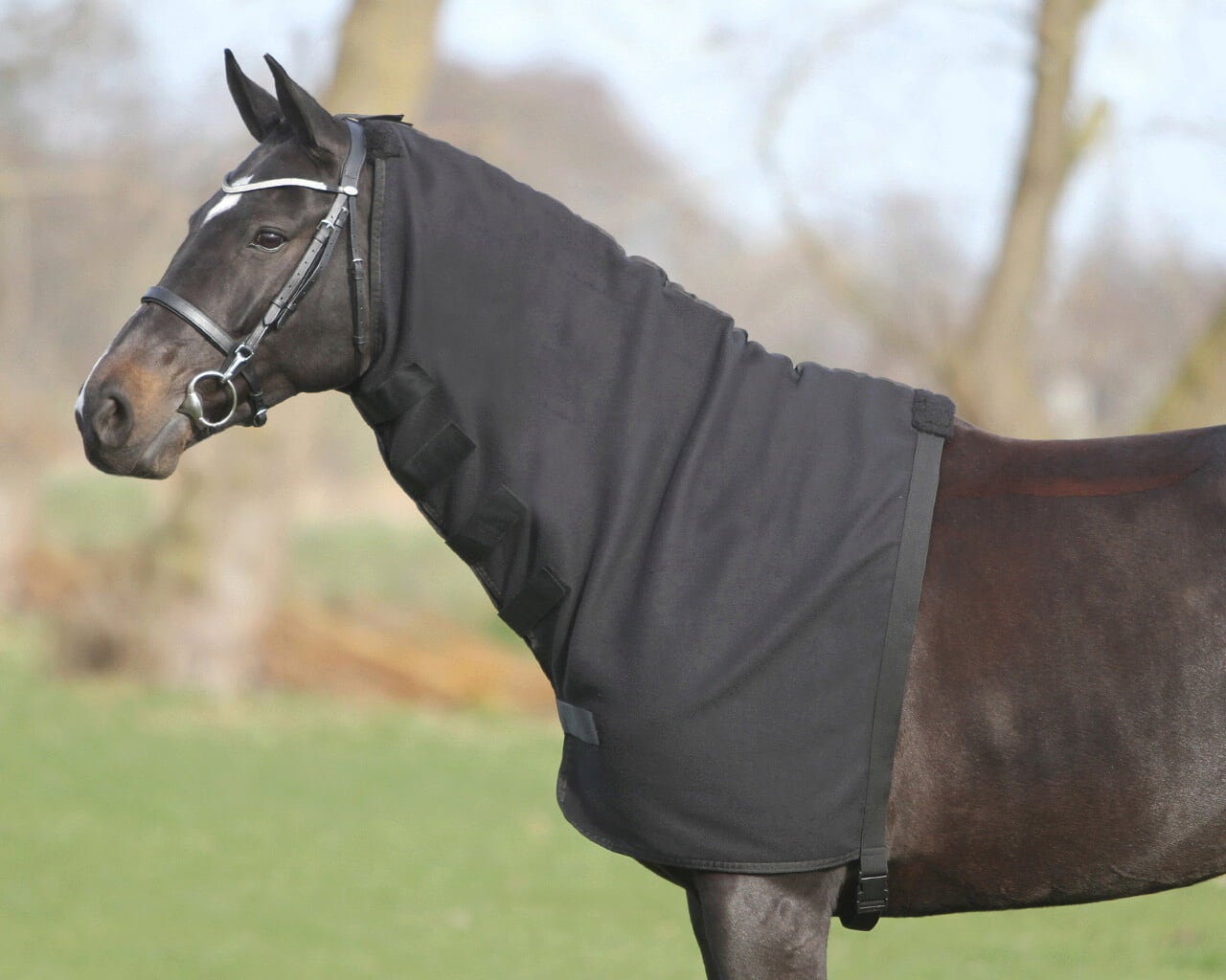 Element na szyję łatwo mocuje się do koca za pomocą pasów na rzepy. Regulowany pasek z taśmy z klamrą zatrzaskową zapewnia idealne dopasowanie. Aby zapobiec otarciom, górna część szyi i kłąb są podszyte miękkim sztucznym futerkiem. Sprytnym detalem jest mała pętelka, która pozwala bezpiecznie przymocować element na szyję do kantara w razie potrzeby.