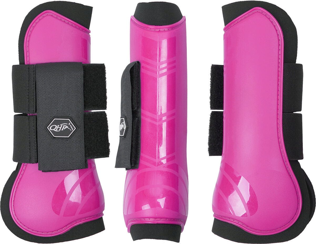 Ten zestaw dwóch anatomicznie ukształtowanych ochraniaczy ze sztywną skorupą w modnym kolorze fuksja idealnie nadaje się jako ochrona nóg konia podczas treningu i zawodów.