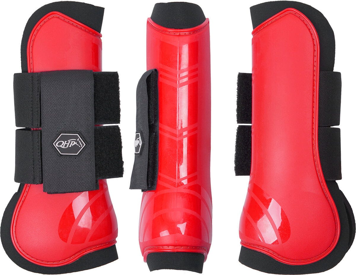 Ten zestaw dwóch anatomicznie ukształtowanych ochraniaczy ze sztywną skorupą w błyszczącym, jasnym czerwonym idealnie nadaje się jako ochrona nóg konia podczas treningu i zawodów.