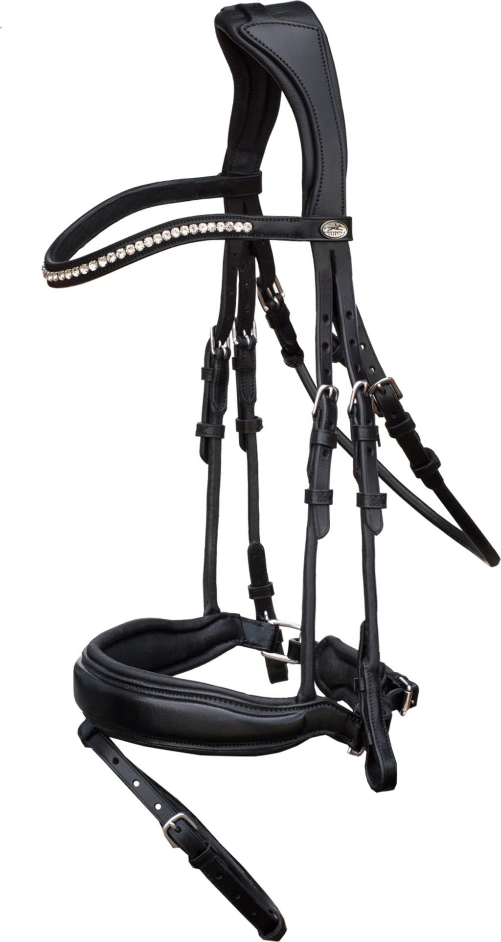 Eleganckie, szyte okrągło ogłowie posiada anatomiczne dopasowanie. Duży łańcuch z kryształkami zdobi wygiętą część czołową. Ogłowie wyposażone jest w policzki z haczykami oraz obustronnie regulowany pasek podgardlany.