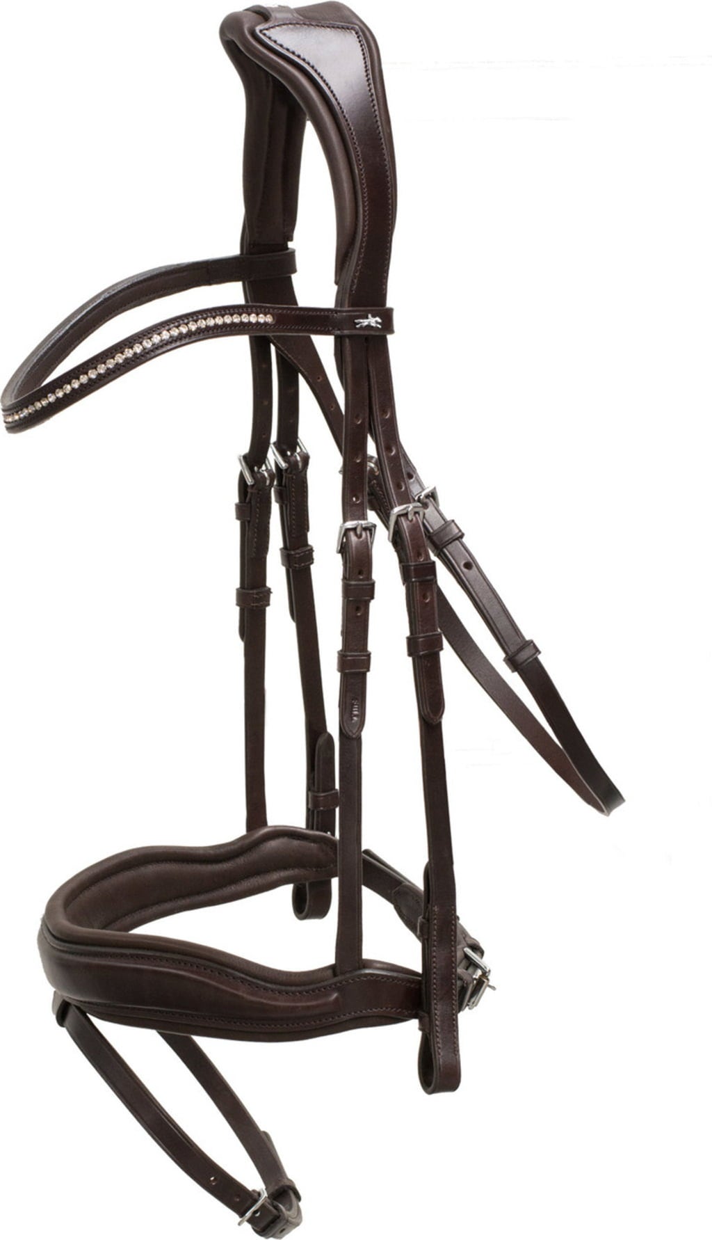 Ta anatomicznie ukształtowana uzda z angielskim łączonym paskiem na nos imponuje wyjątkowym elementem na szyję. Specjalnie dostosowany do anatomii konia, pozwala na nieograniczony ruch uszu. Nacisk jest zmniejszony we wrażliwych obszarach wokół kości policzkowych i szyi, zwiększając w ten sposób komfort konia.