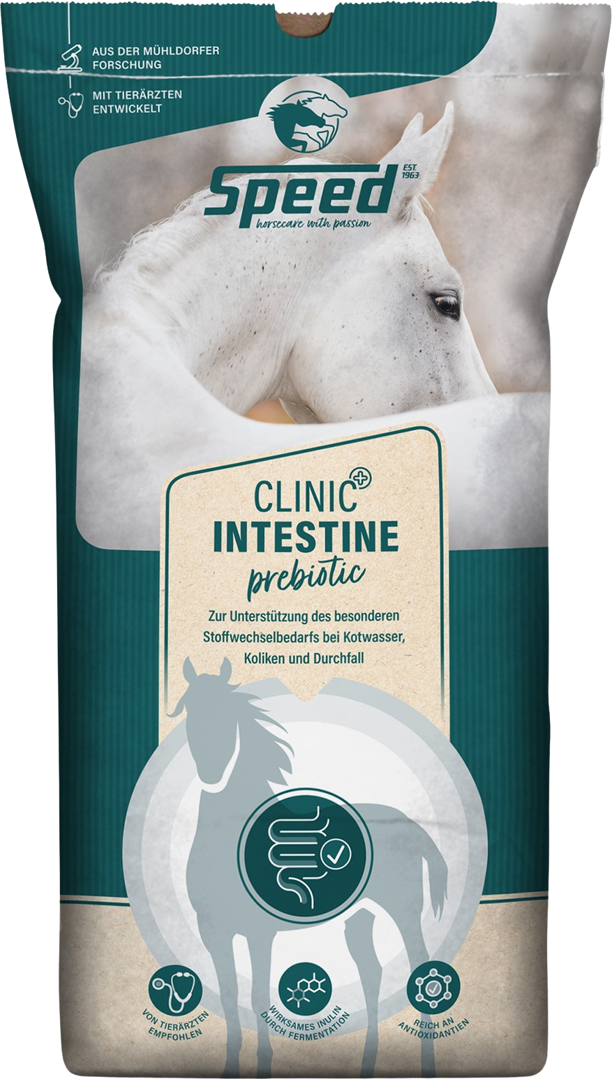 Szukasz szczególnie dobrze tolerowanej paszy dla swojego konia? SPEED Clinic Intestine Prebiotic Musli to kompletny suplement paszowy zaprojektowany specjalnie dla koni z trudnym trawieniem. Opiera się na zbilansowanej mieszance zbóż połączonej ze sfermentowanym koncentratem soku z topinamburu (bogatym w inulinę) - zapewnia to spokojne i zrównoważone pokrycie zapotrzebowania na energię, efektywne wykorzystanie paszy i optymalne zaopatrzenie konia w witaminy, pierwiastki śladowe i minerały.
