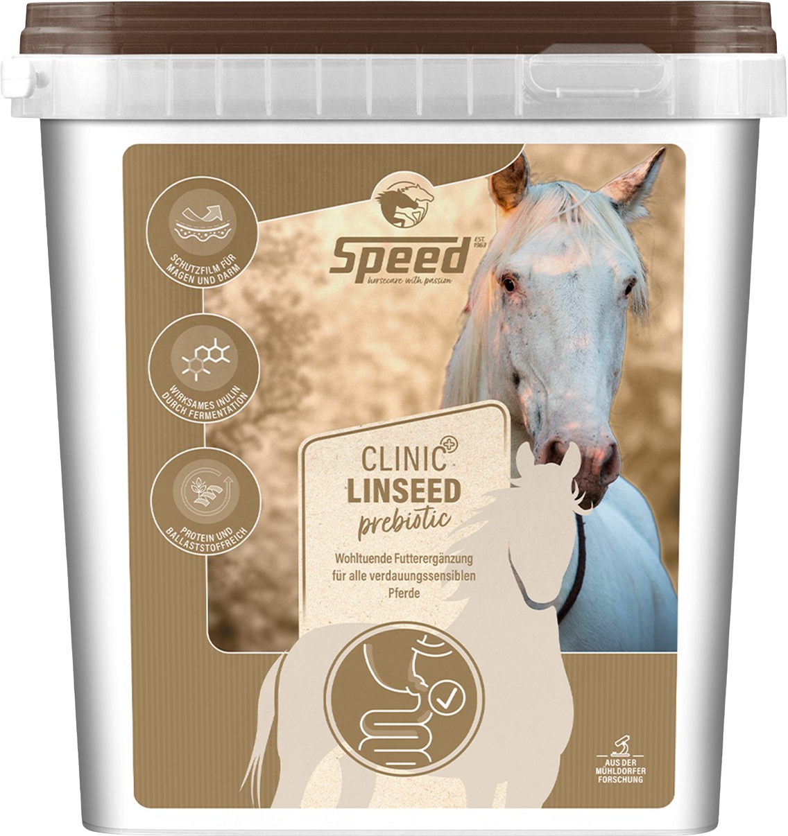 Odkryj SPEED Clinic Linseed Prebiotic, wysokiej jakości suplement dla koni z wrażliwym układem trawiennym: rozdrobnione siemię lniane stanowi centralny element tej specjalnej mieszanki SPEED i zapewnia Twojemu koniowi wyrafinowaną recepturę siemienia lnianego, ziół i sproszkowanego topinamburu.