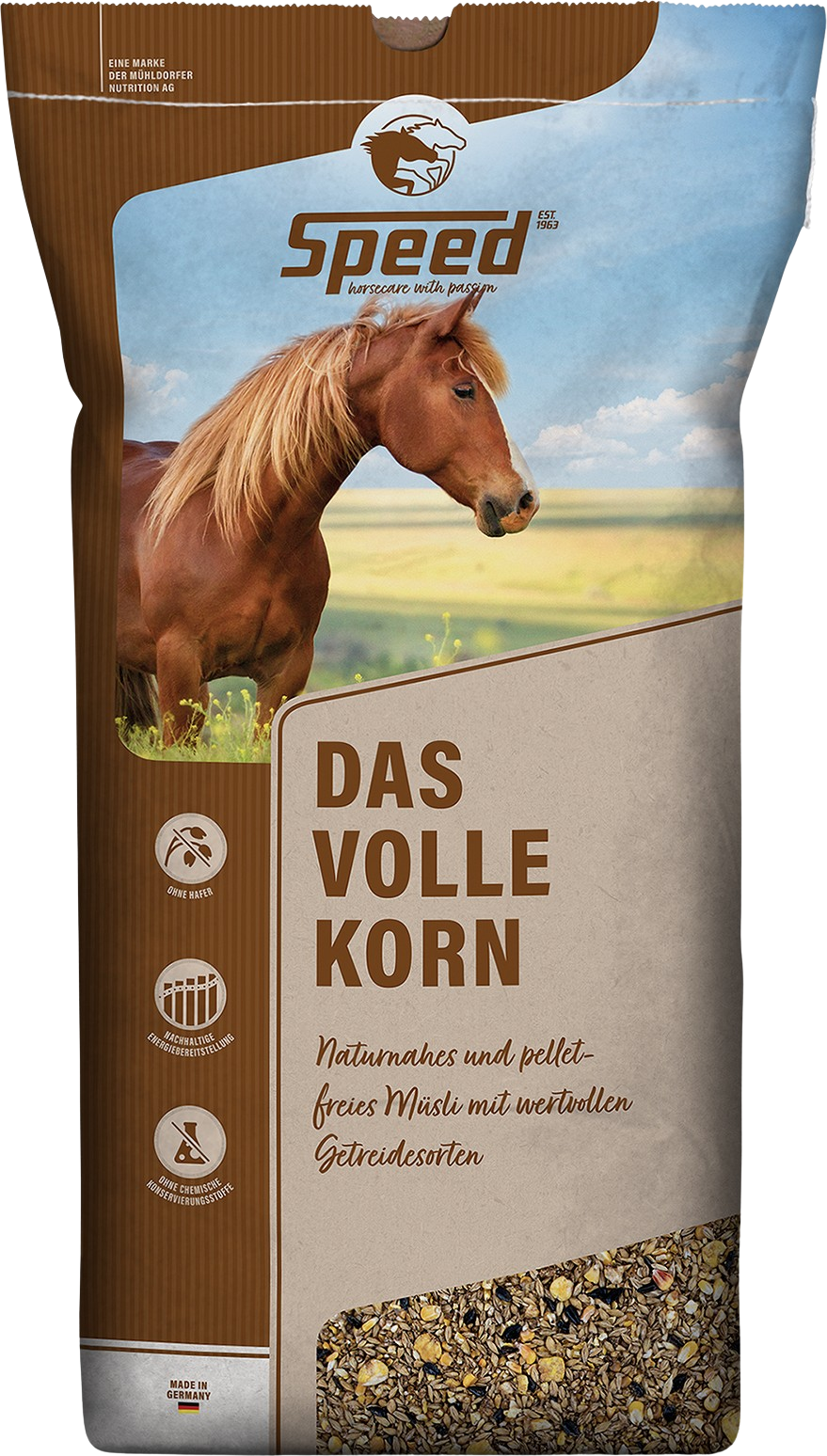 SPEED Das Volle Korn to naturalna pasza dla koni wyprodukowana z wysokiej jakości pełnoziarnistych zbóż. Delikatne procesy trawienia sprawiają, że energia i składniki odżywcze są szczególnie łatwo dostępne, dzięki czemu mogą być optymalnie wchłaniane przez konia.