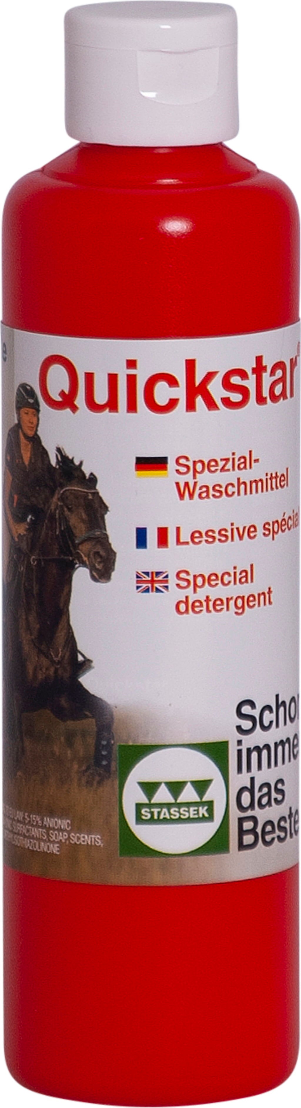 Quickstar to niezawierający fosforanów, a przede wszystkim nawilżający specjalny detergent, który jest szczególnie odpowiedni do trudnego prania, np. odzieży skórzanej lub obszytej skórą. Jest idealny do prania kurtek skórzanych, odzieży motocyklowej, bryczesów jeździeckich, fotelików samochodowych, futer dziecięcych i innych, jedwabiu, wełny, neoprenu, zaawansowanych technologicznie tkanin specjalnych i mikrowłókien.