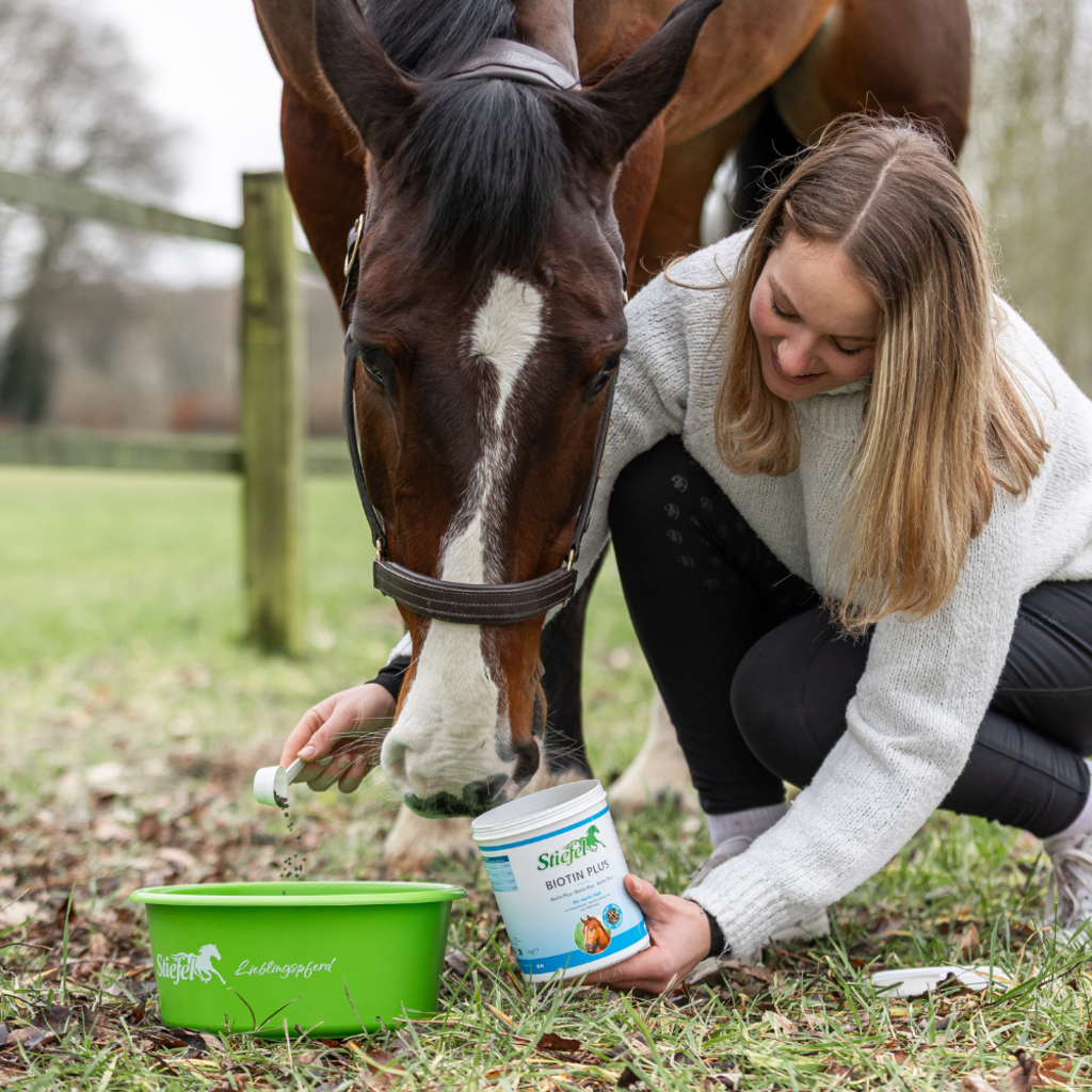 Biotyna Plus pellet Stiefel jest dodawana do paszy w przypadku niedoboru biotyny i dzięki skutecznej potrójnej formule biotyny, metioniny i cynku może pomóc poprawić jakość kopyt. Jeśli koń cierpi na niedobór biotyny, może to mieć negatywny wpływ na wzrost kopyt, a także na ich elastyczność i odporność. Ponadto jakość sierści może ulec pogorszeniu: wynikiem może być łuszczenie się sierści i podrażnienie skóry.