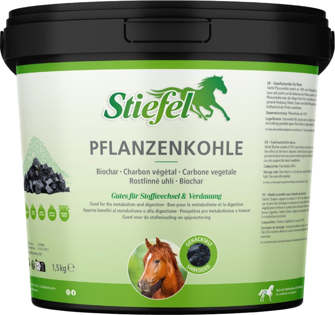 Węgiel roślinny marki Stiefel składa się w 100% z czystego węgla roślinnego, który jest istotnym wsparciem podczas problemów żołądkowo-jelitowych, takich jak kolka, wodniste stolce, skurcze brzucha i wzdęcia. Ponadto wspomaga proces trawienia i ma pozytywny wpływ na metabolizm konia.
