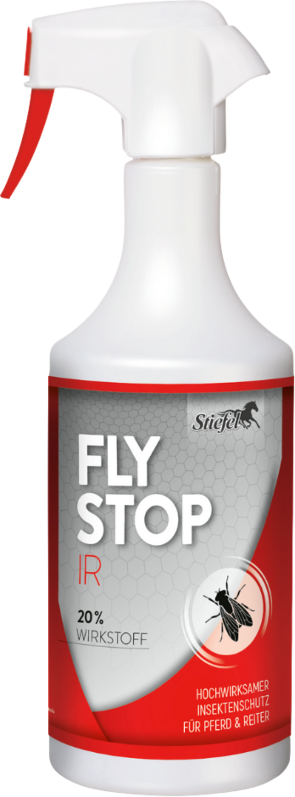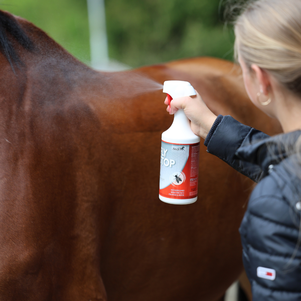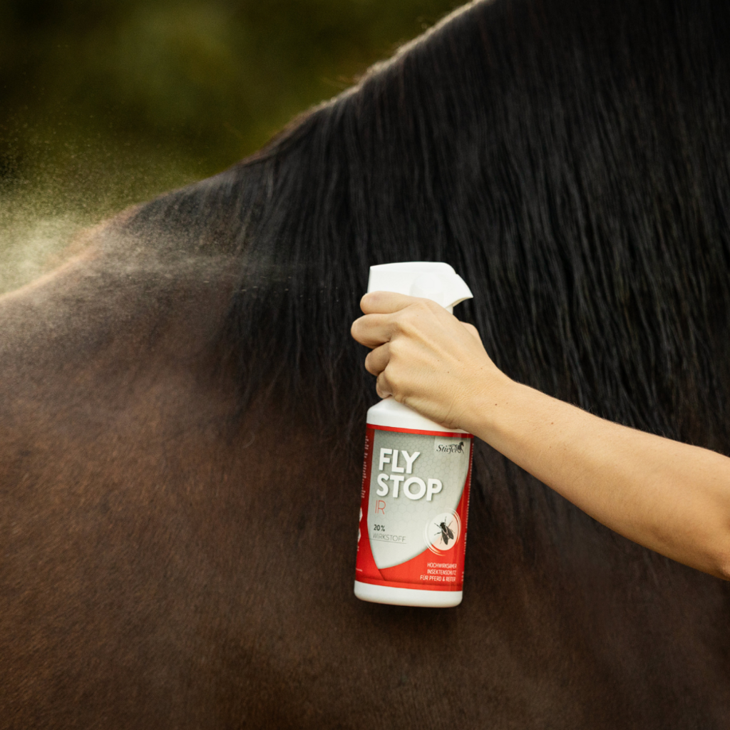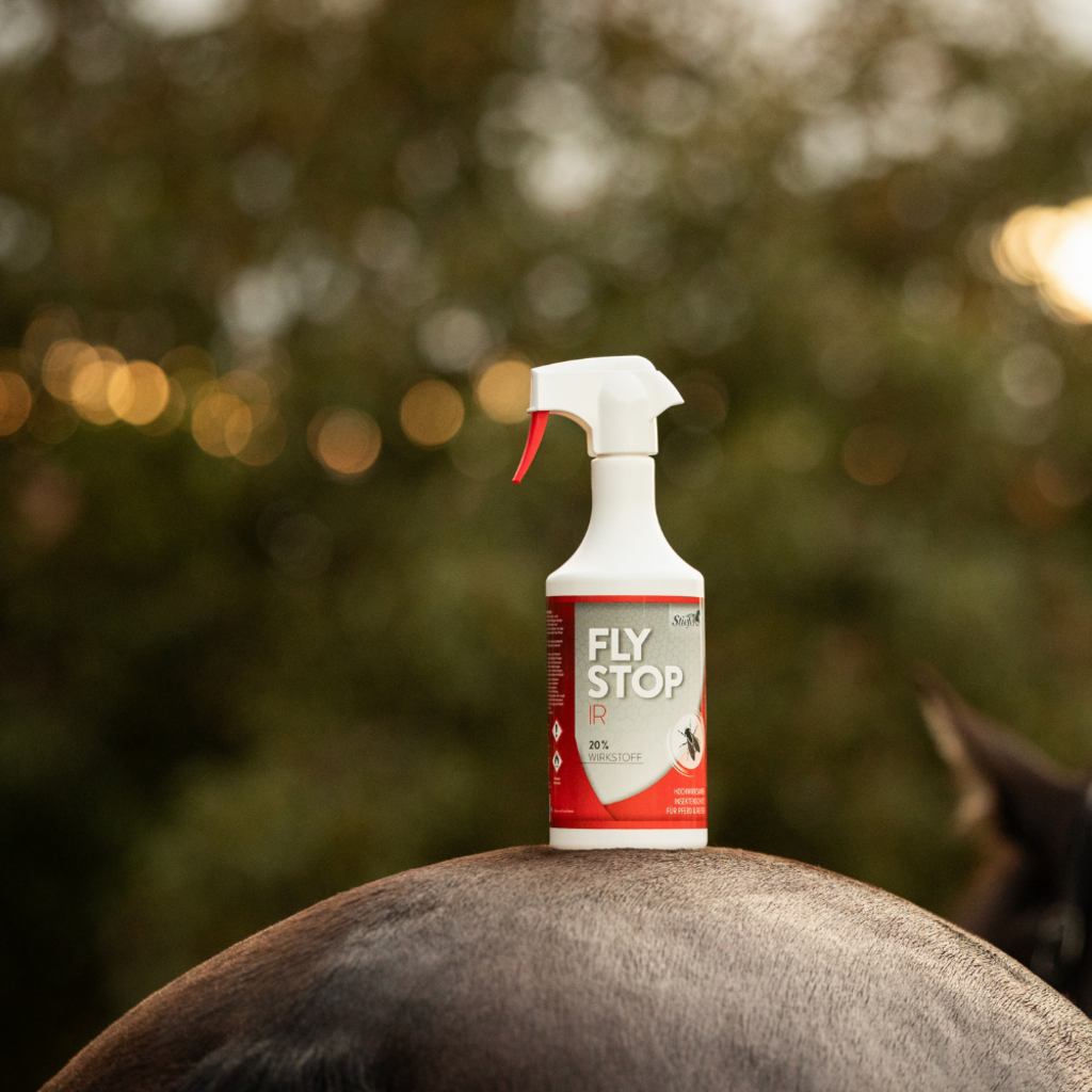 FlyStop IR Stiefel to nowy aktywny środek chroniący przed owadami zgodnie z rozporządzeniem o środkach biobójczych. FlyStop IR zawiera aktywny składnik IR3535®, który może mieć długotrwały efekt przeciwko meszkom, kleszczom i muchom. Aktywny składnik IR zapewnia ochronę przez wiele godzin i ma łagodny zapach, dzięki czemu ani koń, ani jeźdźcy nie będą odczuwać nieprzyjemnego zapachu. Ponadto składnik aktywny jest bardzo dobrze tolerowany przez skórę i dlatego jest odpowiedni również dla wrażliwych koni i jeźdźców. Aby uzyskać optymalną skuteczność, FlyStop IR należy spryskać na całego konia. Ze względu na lotne właściwości składnika aktywnego tworzy się cienka, ochronna mgiełka zapachowa która może utrzymywać się przez kilka godzin.