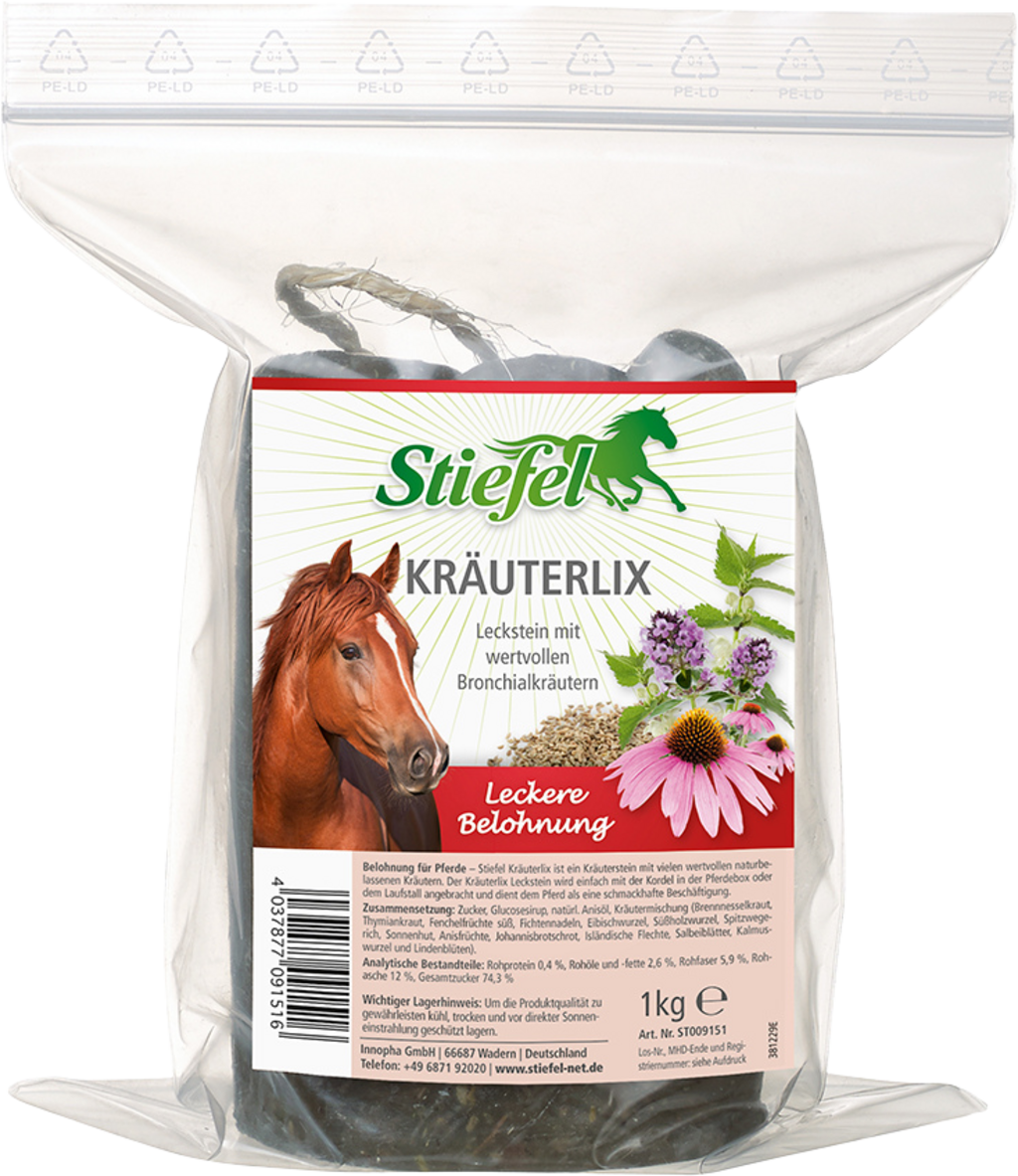 Lizawka ziołowa Stiefel to kamień ziołowy wykonany z mieszanki ziół oskrzelowych dla smacznej aktywności. Lizawka ziołowa jest dostarczana ze sznurkiem, dzięki czemu można go swobodnie powiesić w stajni lub na padoku.