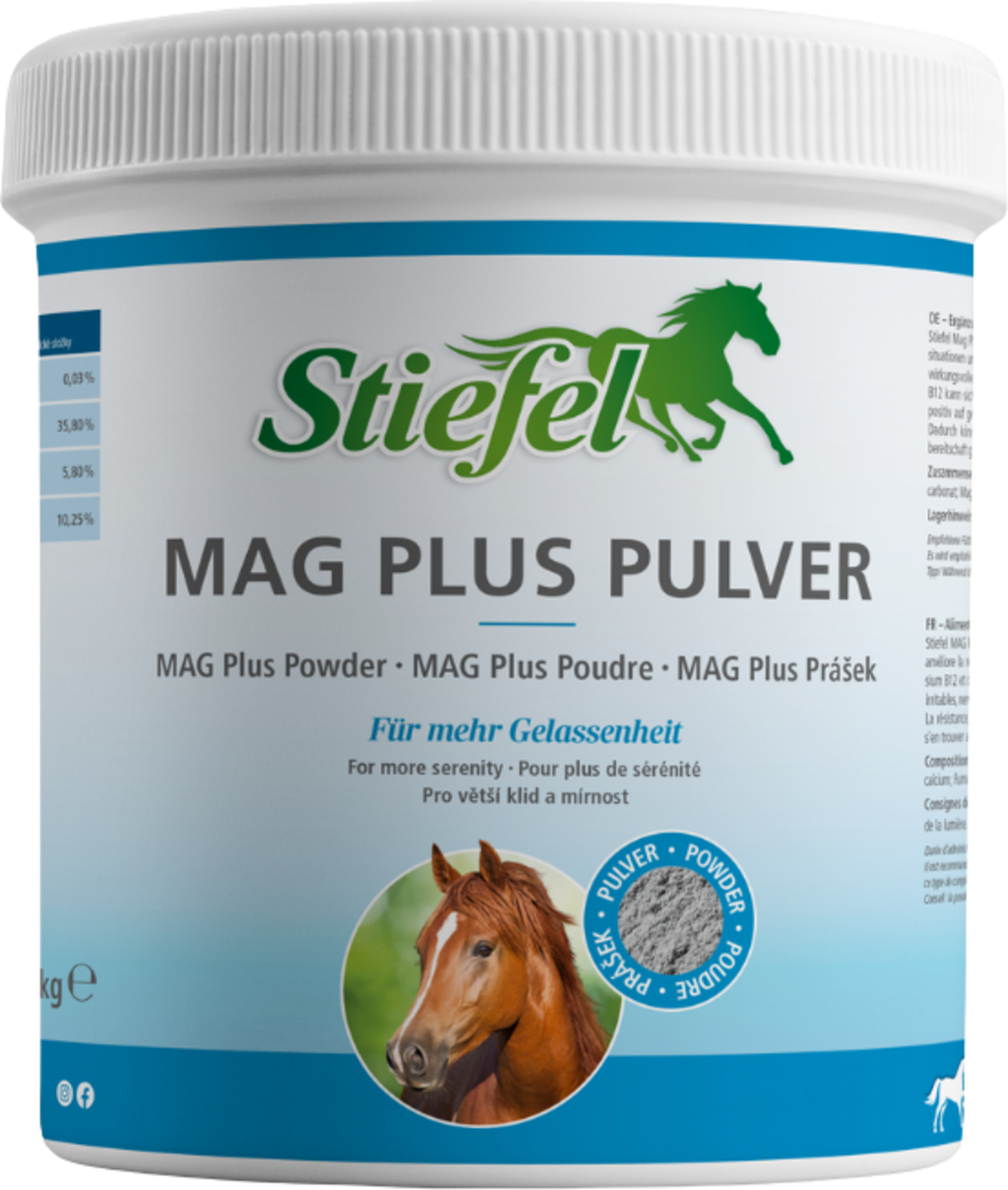 MAG Plus proszek Stiefel zawiera połączenie magnezu, witaminy E i witaminy B12 w celu zmniejszenia reakcji stresowych u koni. Jeśli koń jest zestresowany, potrzebne są duże ilości magnezu, ponieważ magnez, jako przeciwnik wapnia, może ponownie znormalizować zwiększoną czynność serca. Podobnie, gdy uwalniane są hormony stresu, takie jak kortyzol i adrenalina, wydalane jest więcej magnezu. Jeśli poziom stresu u konia wzrasta, wzrasta również zużycie, a tym samym zapotrzebowanie na magnez.