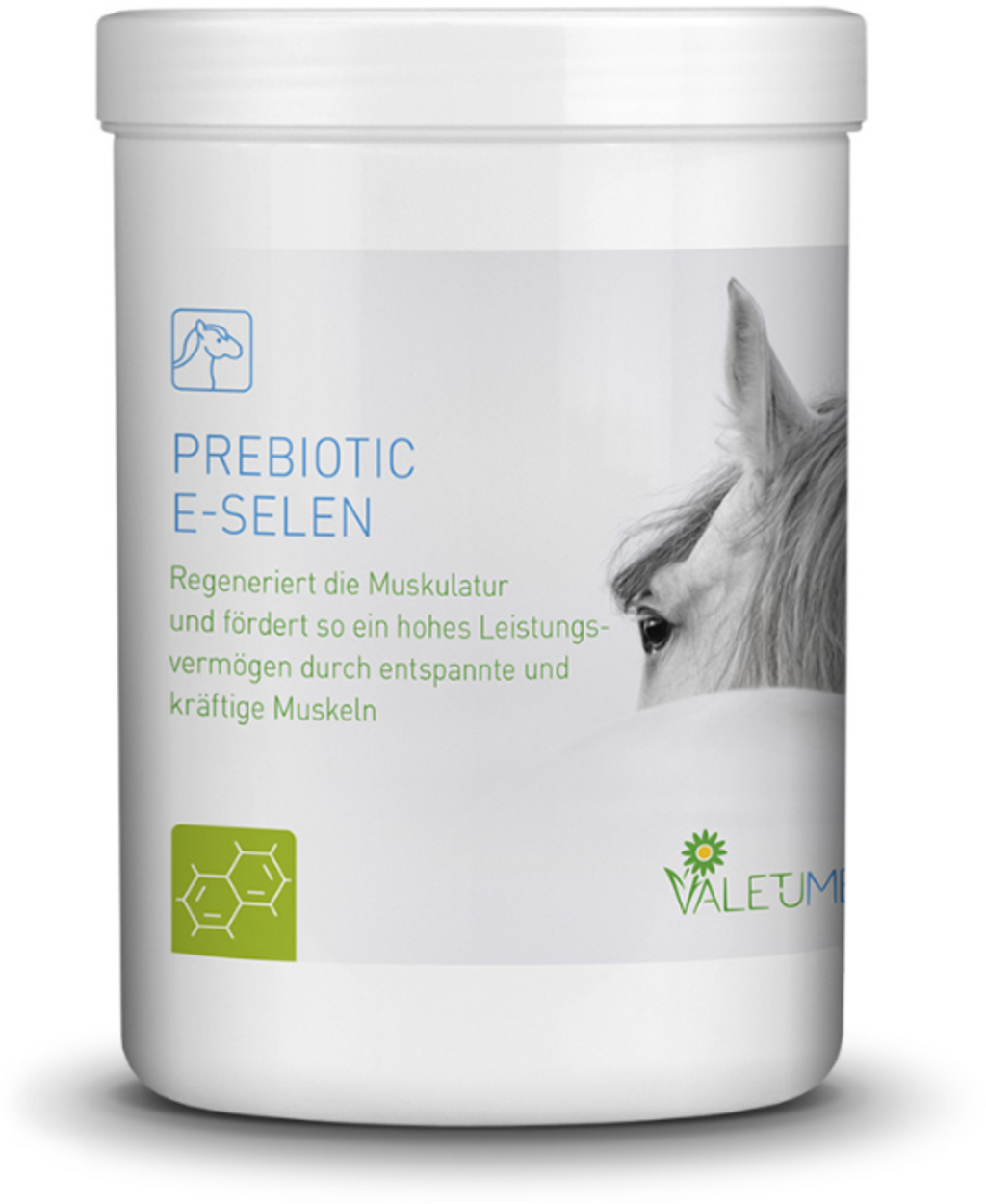 Prebiotic E-Selen marki Valetumed oferuje ukierunkowaną kombinację składników odżywczych, aby zaspokoić zwiększone zapotrzebowanie na witaminę E i selen u koni sportowych i wyczynowych. Dzięki dodatkowi tych wybranych składników odżywczych można w naturalny sposób wspierać ogólną chęć do pracy i jezdność konia.