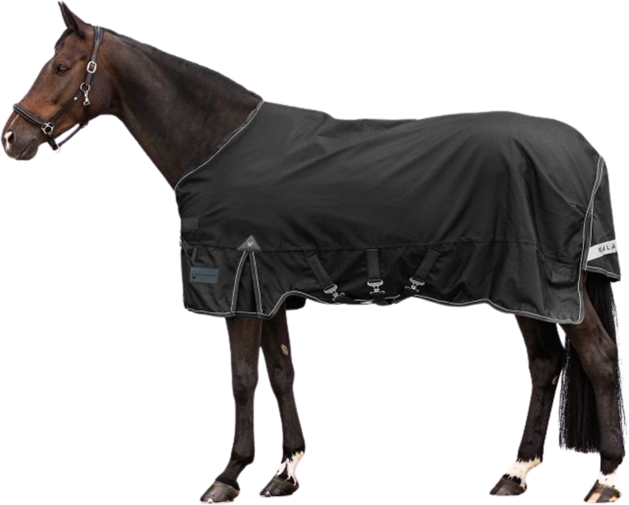 Dopasowanie jest dobrze przemyślane: praktyczne zapięcie z przodu w kształcie litery V gwarantuje stabilne dopasowanie i, w połączeniu z trzema paskami na brzuchu, zapobiega irytującemu poślizgowi. Swoboda ruchów jest zawsze gwarantowana dzięki obszernemu klinowi. Aby zapewnić jeszcze większą elastyczność w zimie, ten dywanik ma pętle mocujące - dzięki czemu można w dowolnym momencie przymocować oddzielnie dostępną część szyjną. Derka ma wyjątkowo dużą klapkę przeciw poceniu się, a odblaskowe lamówki zapewniają optymalną widoczność po zmroku.