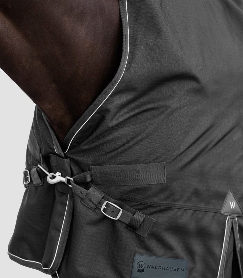 Scandic imponuje również dopasowaniem: nowe, jednoczęściowe zapięcie z przodu w kształcie litery V w połączeniu z trzema paskami na brzuchu gwarantuje idealne dopasowanie i zapobiega irytującemu poślizgowi. Twój koń cieszy się nieograniczoną swobodą ruchów dzięki klinowi, a wyjątkowo duża klapa na ogon i odblaskowe lamówki zapewniają optymalną widoczność w ciemności.