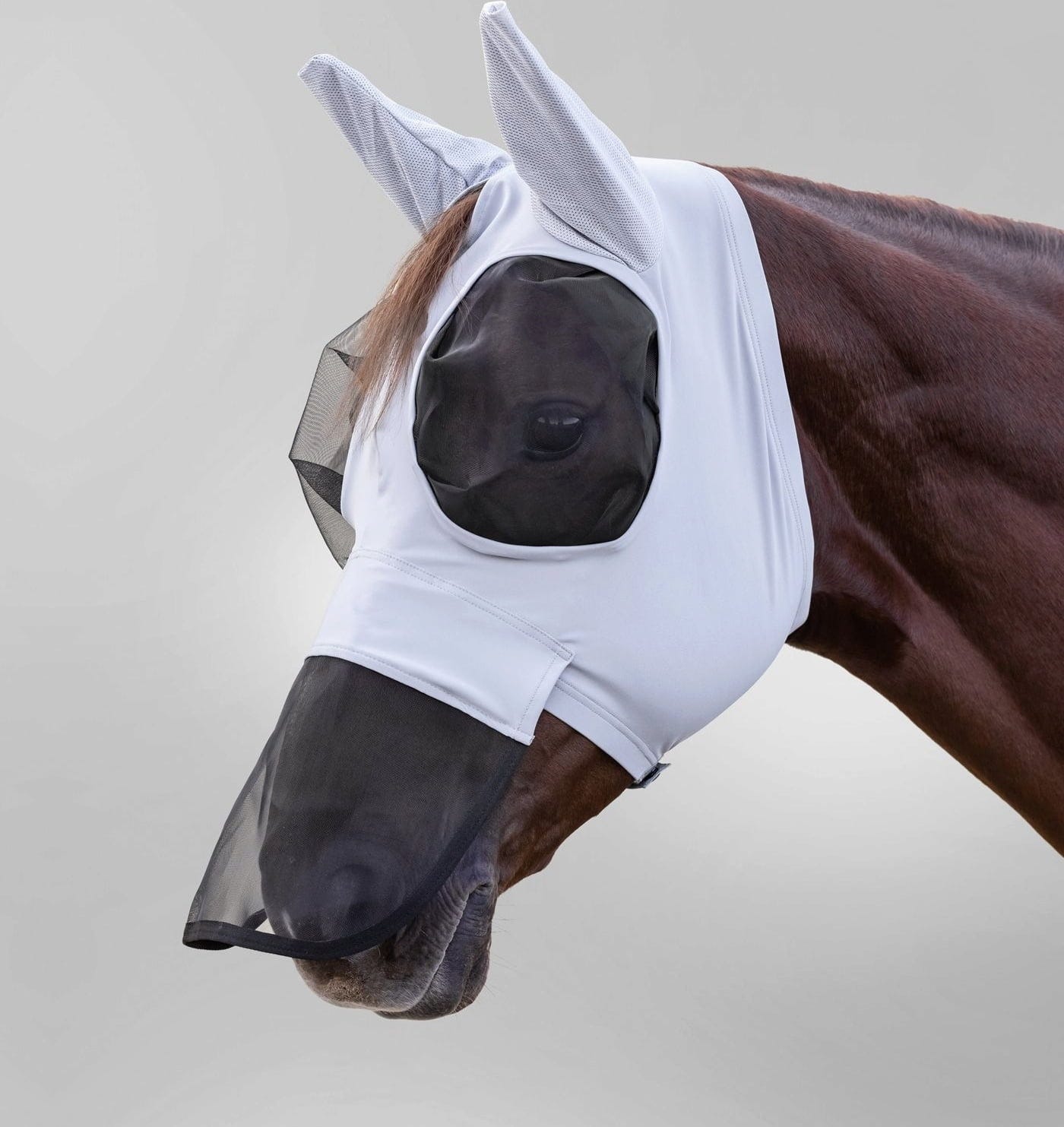Wszystkie krawędzie maski zostały wykończone miękkim polarem, który skutecznie zapobiega otarciom i zapewnia delikatne przyleganie do skóry. Przepuszczające powietrze części uszne oferują dodatkową ochronę przed meszkami, zapobiegając jednocześnie gromadzeniu się ciepła. Dzięki szerokiemu zapięciu na rzep ochrona może zostać w łatwy sposób dopasowana do głowy konia, pozostając stabilną nawet podczas ruchu na padoku. Funkcjonalne i wszechstronne rozwiązanie dla wszystkich poszukujących nieskomplikowanej ochrony całego pyska.