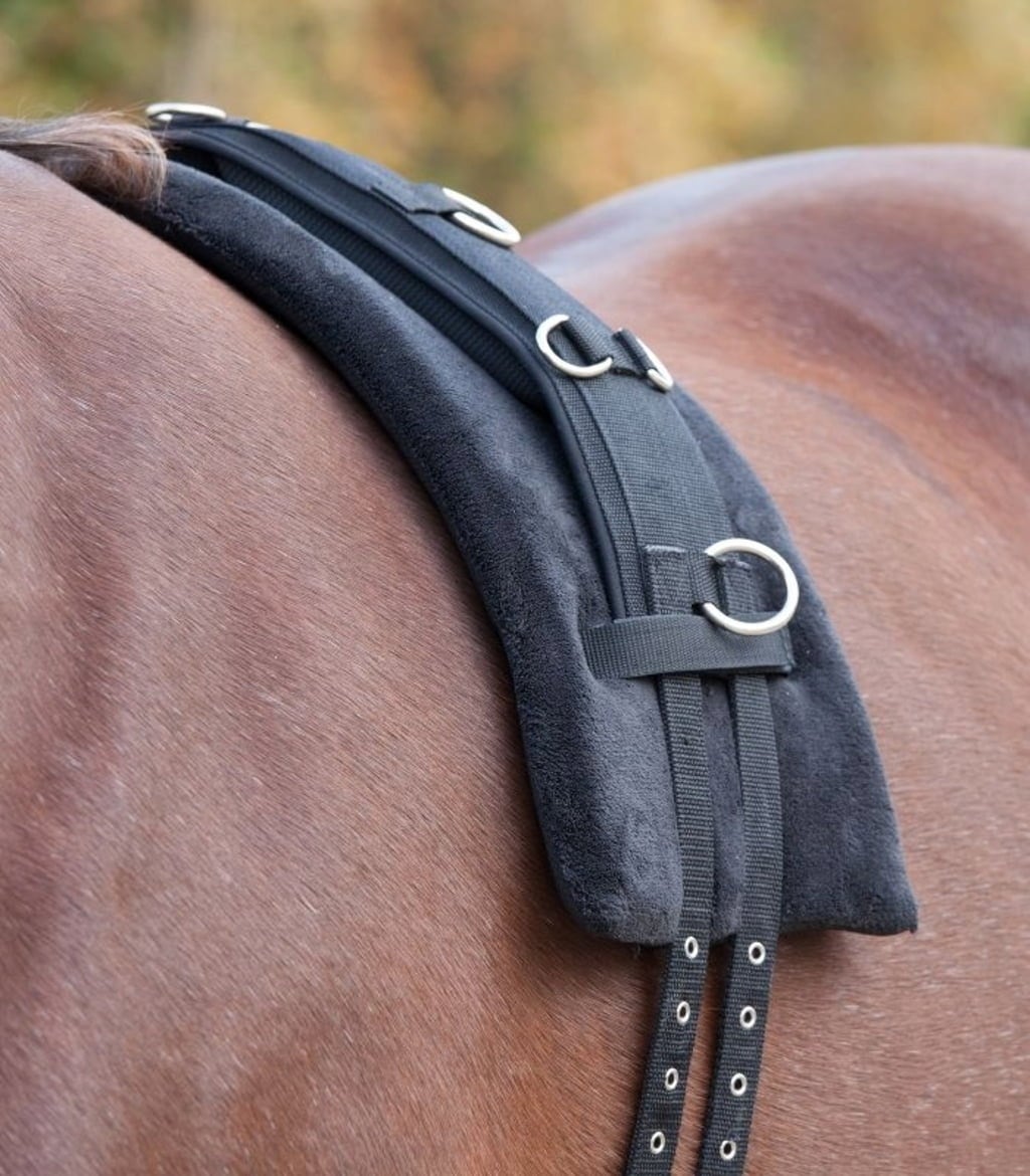 Aby upewnić się, że podkładka zawsze pozostaje na swoim miejscu, niezawodne zapięcia na rzep zapobiegają jej ześlizgiwaniu się z popręgu. Gumowana strona ma również zintegrowane otwory wentylacyjne. Ta innowacyjna funkcja zapewnia doskonałe odprowadzanie ciepła i wilgoci z ciała, dzięki czemu koń pozostaje przyjemnie chłodny nawet podczas intensywnej pracy.