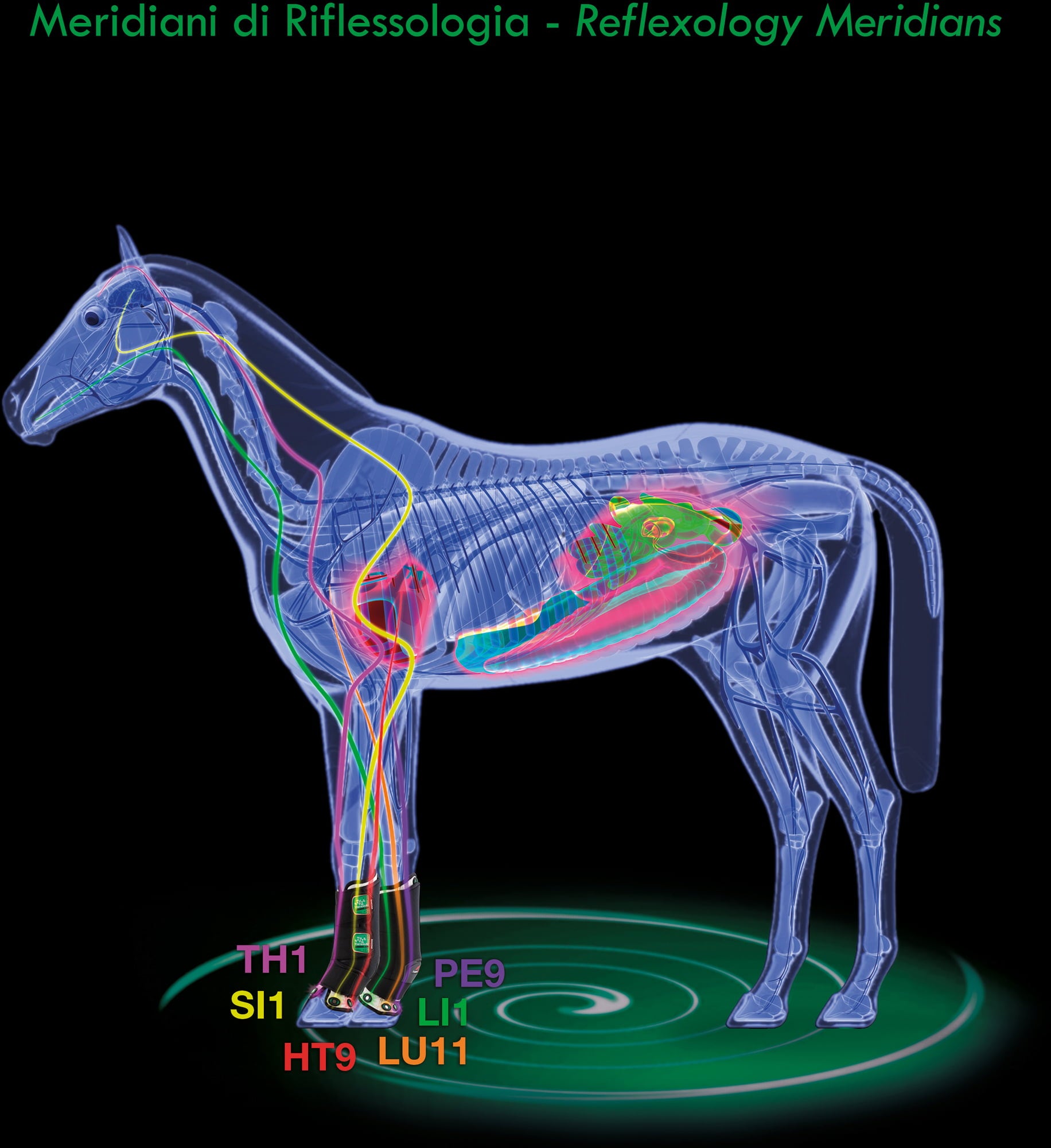 Zasady refleksologii, stymulujące punkty refleksyjne (Ting), są umieszczone na określonych meridianach konia. Te same punkty są wykorzystywane w fizjologii koni do akupunktury: